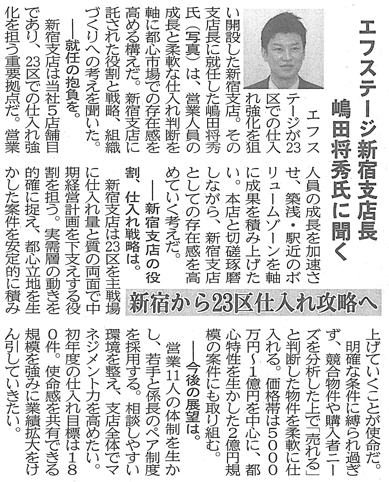 2026.01.08 メディア掲載住宅新報に「新宿支店開設」のインタビュー記事が掲載されました2026年1月6日号の住宅新報に、新宿支店開設について新宿支店・支店長のインタビュー記事が掲載されました。※「新宿支店 新規開設」のプレスリリースはこちら出典:住宅新報2026年1月6日号 6面 一覧に戻る